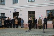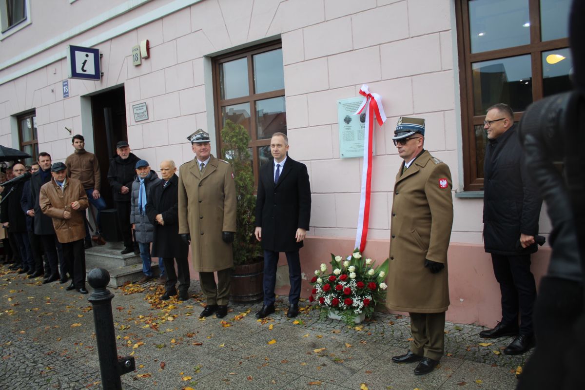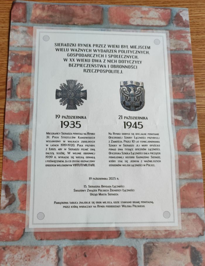 "Tablicę pamiątkową powitania w Sieradzu dn. 19.10.1935 r. 31 Pułku Strzelców Kaniowskich oraz powitania w Sieradzu dn. 21.10.1945 r. Oficerskiej Szkoły Łączności " odsłonili: Cezary Tomczyk - sekretarz stanu w Ministerstwie Obrony Narodowej, gen. dyw. Tomasz Dominikowski - dowódca Garnizonu Warszawa, Paweł Osiewała - prezydent  Sieradza oraz płk Sławomir Kozłowski – dowódca 15 Sieradzkiej Brygady Łączności.